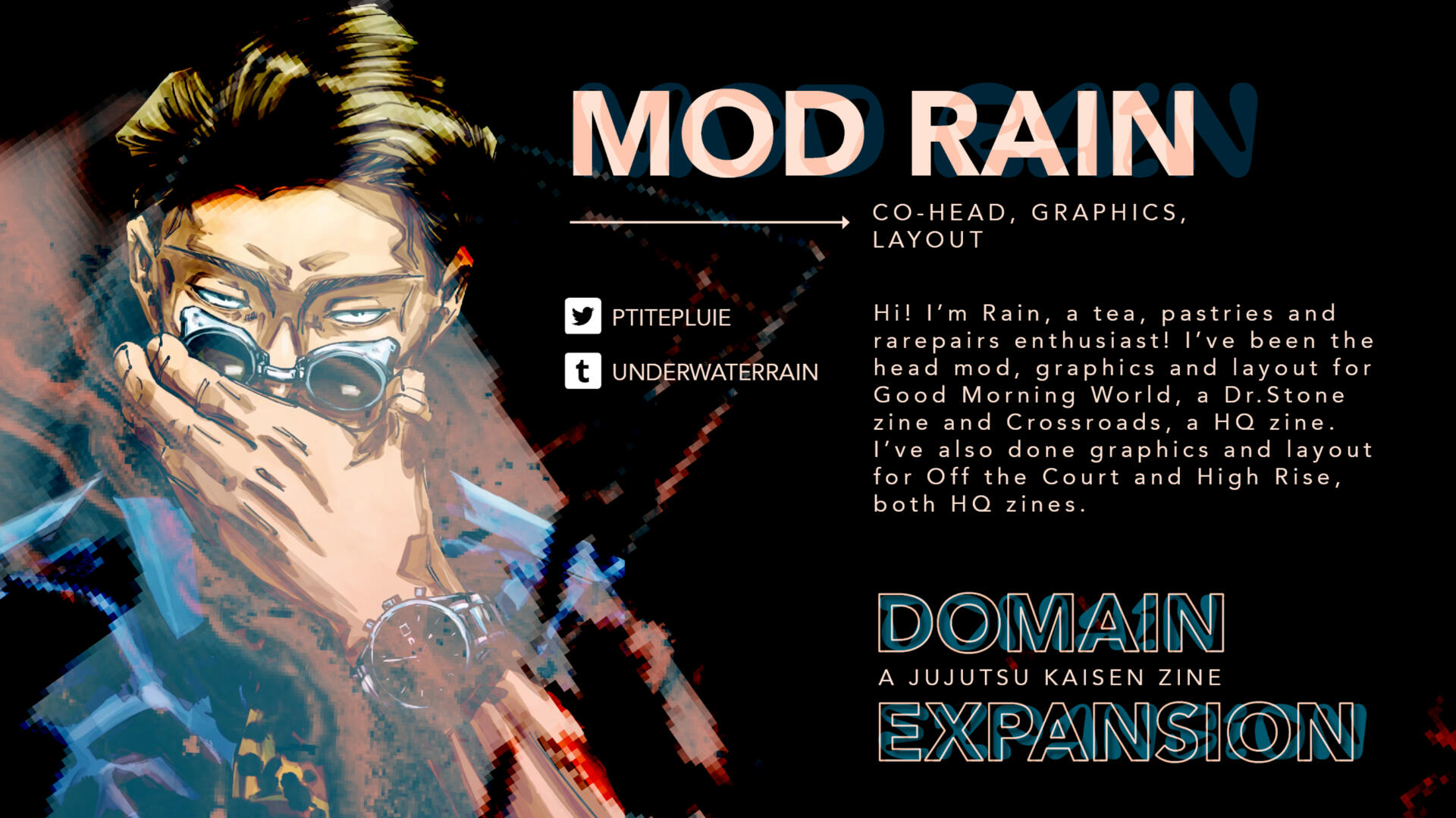 Hi! I’m Rain, a tea, pastries and rarepairs enthusiast! I’ve been the head mod, graphics and layout for Good Morning World, a Dr.Stone zine and Crossroads, a HQ zine.